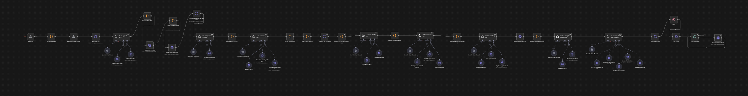 n8n workflow integrating frontend with backend to third-party carrier APIs—performing validation, writing to database, error handling, and agentically filling API requests to retrieve quotes and display results back to the user
